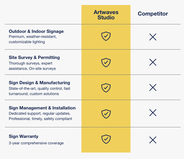 Feel the ArtWaves difference! With exceptional quality, cutting-edge designs, and a commitment to outstanding customer service, we distinguish ourselves in the signage industry. Compare our offerings to the competition and discover why we’re the premier choice for all your signage requirements.